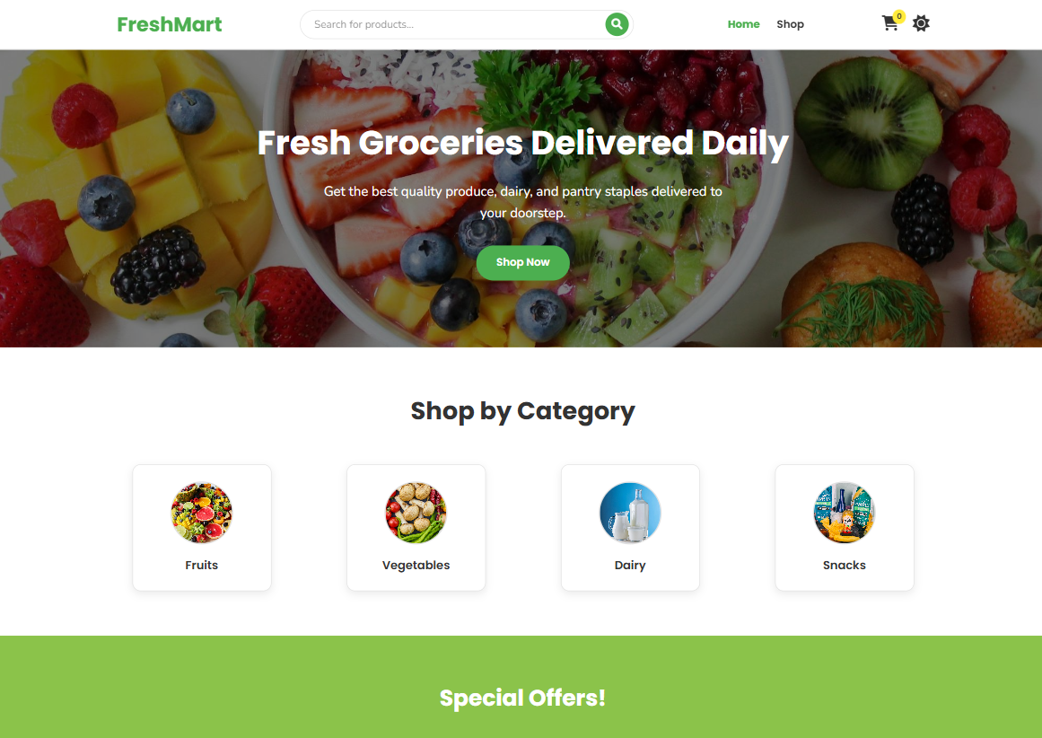 Modern & Responsive Grocery Website Template built with pure HTML5, CSS3, and vanilla JavaScript. Perfect for supermarkets, organic food shops, and grocery businesses looking for a fast, lightweight online presence.