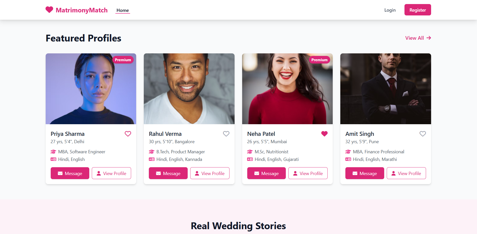 - Featured Profiles – Cards with education, location, language, and action buttons